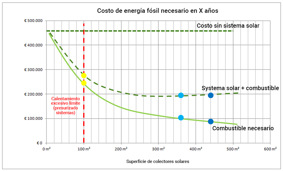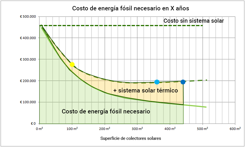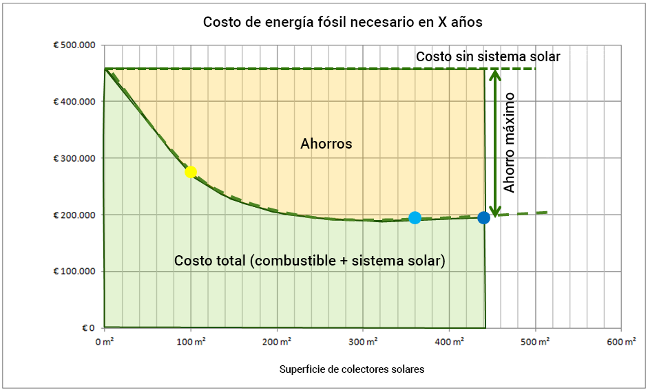 • Es mejor ubicarse demasiado a la derecha de la curva que demasiado a la izquierda. Por lo tanto, haber colocado demasiado colectores que no suficiente. En nuestro ejemplo, colocar 50 m² (demasiado a la izquierda) en lugar de 500 m² (demasiado a la derecha) significa un costo adicional de alrededor de € 185.000!
