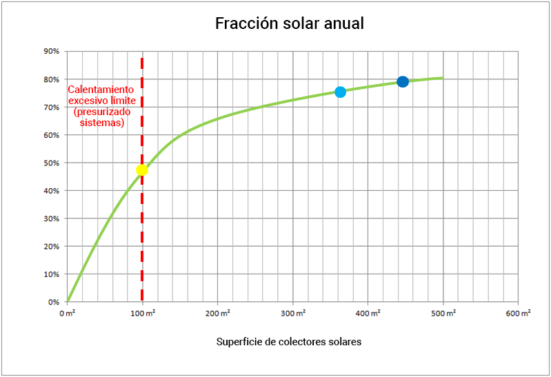 La m² adicionales de una pequeña área de colectores solarestérmicos permiten cubrir una mayor parte de la energía que la misma superficie adicional con una superficie de colectores térmicos solares yamayor. Los primeros 10 m² pueden cubrir el 5% de la energía necesariamientras que 10 m² a más de 300 m², sólo harán un 2-3% más.